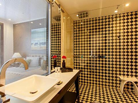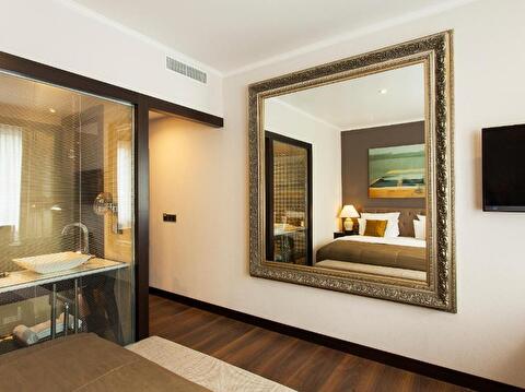 Stay in our modern and stylish Double Room. This room includes an LED smart TV, free WiFi, and air conditioning for your comfort. Relax on a pillow top mattress and enjoy the modern bathroom, which features Italian marble, a rain shower, and complimentary toiletries. Some rooms also offer a balcony, enhancing your stay with extra space and views.